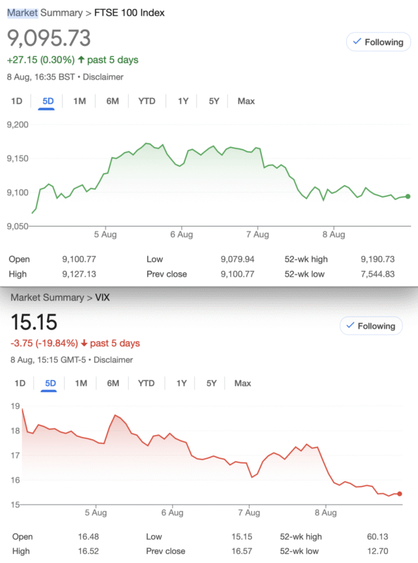 This week 9000 put 20.5, 8750 put 3.5(x3) Well, we’re in profit our cost was 3 and we have a credit now of 10 (300% win– we could brag, but unless we’d traded 200 contracts it’s not worth much, at £70 for a 1×3