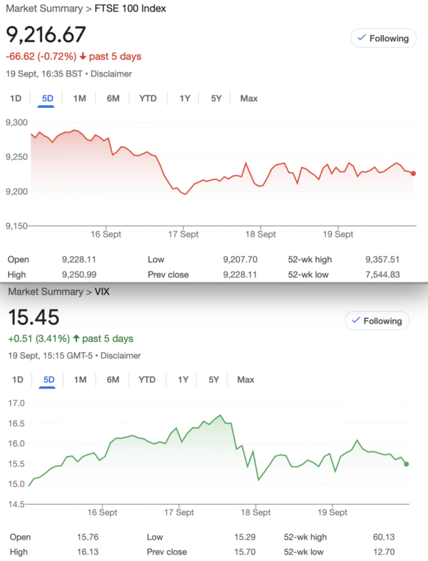 9210.85 That was expiry level in a curious week of concerns over a state visit. Congratulations to our security services for protecting all and sundry. There were some protests and notable pictures of a certain Mr Epstein and a friend, but no violence. So, markets in the US continue to see new all time highs, while FTSE has eased off a bit. However, even if this signals a lack of enthusiasm for our dreary little corner of the world a tiny 0.72% drop is nothing, and we keep getting these small range days. VIX is not really telling us anything and in the 6 month chart VIX has been under 20 since end July and the bands are tightening. You probably know that volatility can plod along in an unrealistic narrow range for a while. this may reflect the amount of also trading in big volumes trading small moves.
