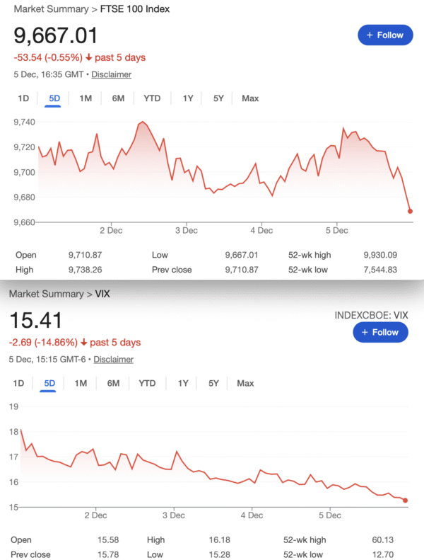 We are looking for clues constantly from options prices and clues are there none. Naturally it is more nuanced than simply extreme highs or lows of volatility. VIX has not hit the high of 45 from the end of March and again it made a big swoon. Active traders know to look at ‘open interest’ but the clues here are less obvious. December sees a spike in OI at the 9200 strike both calls and puts. So what else can we find? Unsurprisingly the ‘wide stranglers’ like 9000 puts and 10000 calls. You could argue that simply selling options in a low volatility environment is profitable and boring. FTSE index is being a little unconvincing and personal bias tends to claim the day. We hope to be overall neutral with the weekly trade.