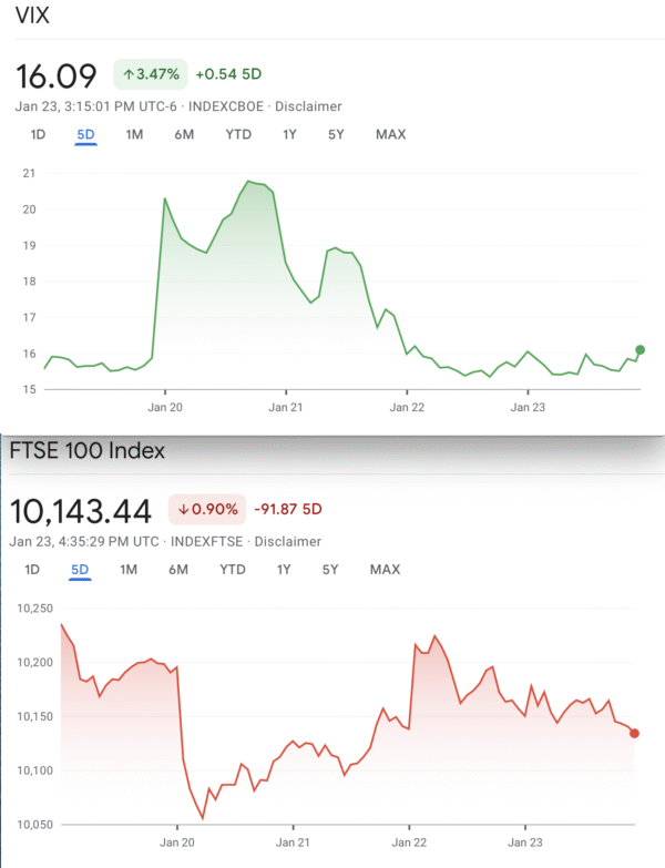 Given a renewed interest in internet stuff, we have changed from Google to Ecosia as the search engine, hence the new FTSEVIX graphic. The reasons for this are twofold, https://www.ecosia.org has amazing green credentials and may be more Anglo friendly. The world seems to be gravitating away from US dominance in every facet of our lives. Political again, sorry. However this is a rabbit hole as are most things on the ‘net. AI may be giving us nuanced answers and there may be differences between American and European providers. Yours truly is swamped with financial punditry none of which has made trading any better. Youtube fans will know this story, and it’s hard to resist the clickbait headings such as ‘All Hell broke Loose’. No it hasn’t!
